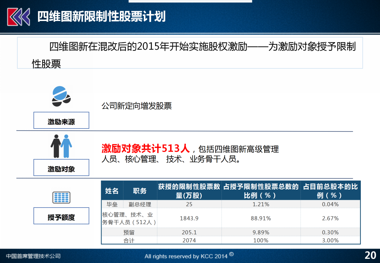 这就是一个上市公司股权激励的案例,四维图新把本公司的混合所有制的股权改革,降低国有股比,释放战略投资人的能力,再加上发行的限制性股票相结合的股权激励改革,实际上是实现了一个非常好的科技型上市公司,进一步深化改革强化激励的模板。