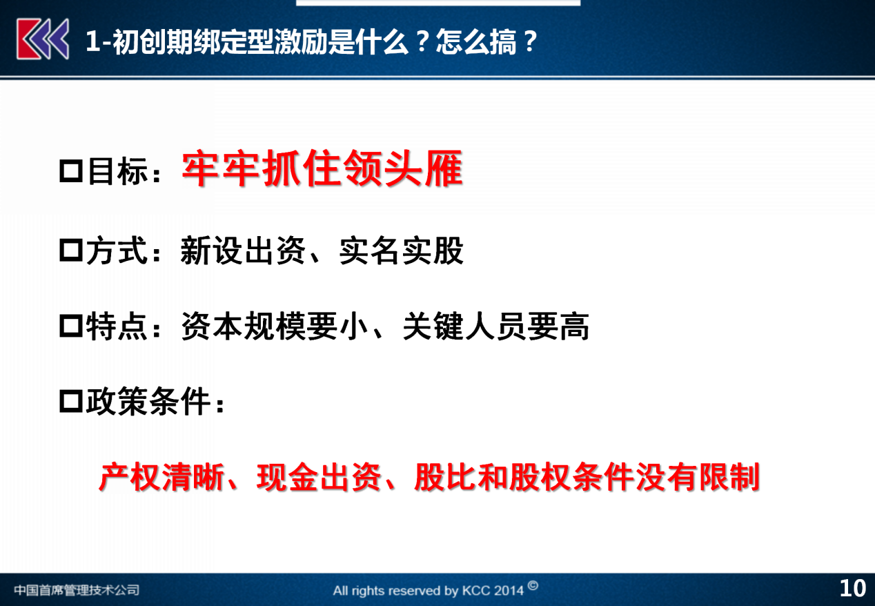 我想告诉各位,在新设公司这个方面,如果大家遵守了本公司的投资管理的相关规定,按程序报批投资的决策,实现公司的产权清晰,同时所有股东都是按照等比例的现金出资的原则来做的话,在股比与股权条件方面没有什么其它的限制,因而在新设公司进行初创期绑定型激励方面给大家提供了非常大的政策空间。那么,希望大家能够对于自己是哪一类的公司有一个判断。