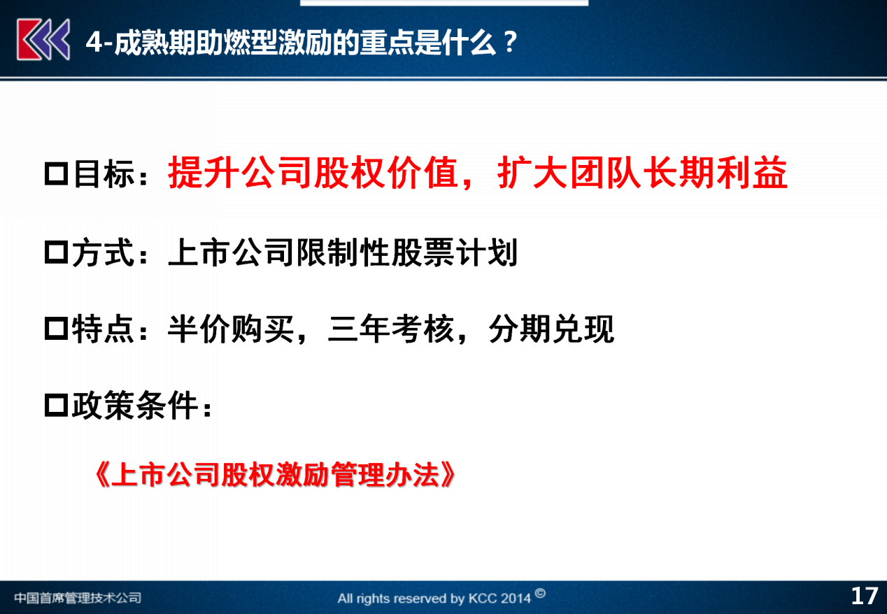 成熟期的企业,我们这里特地指是已经完成了资本市场上的挂牌,已经成为上市公司的一员。这样的公司应该如何来进行激励?它的激励目标,跟前面的三个阶段是不太一样,这里有两句话:第一句是做提升公司的股权价值,第二句是扩大团队的长期利益。