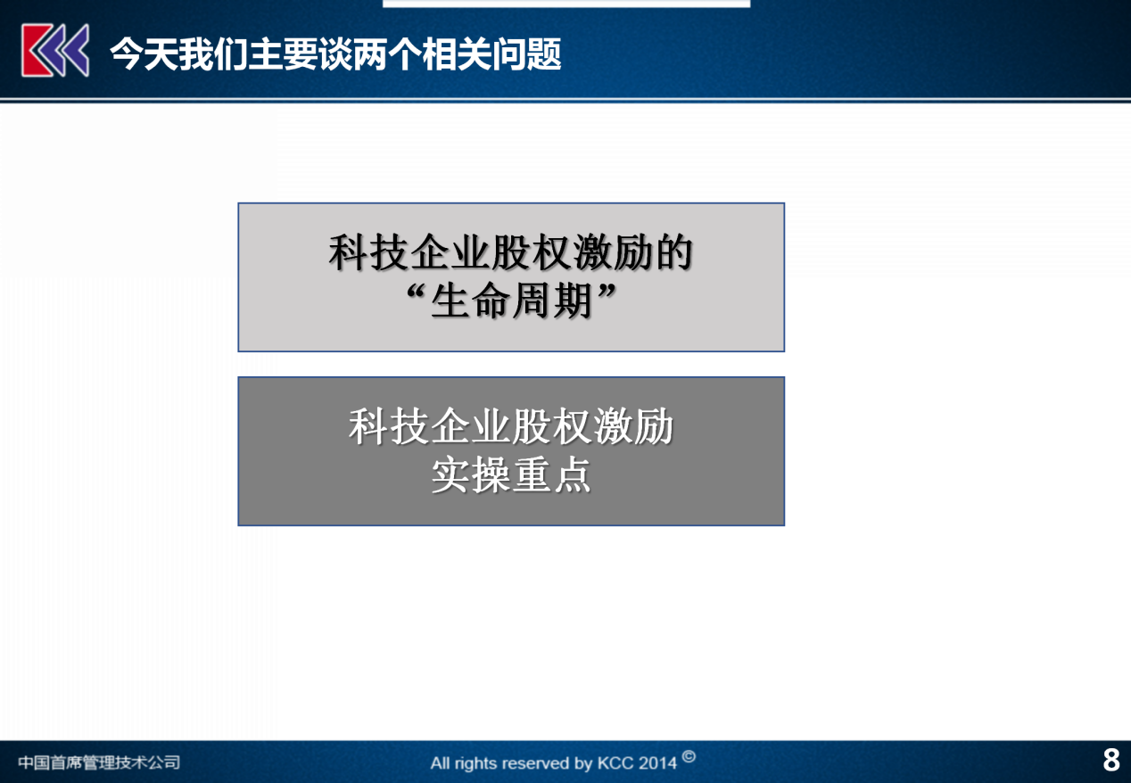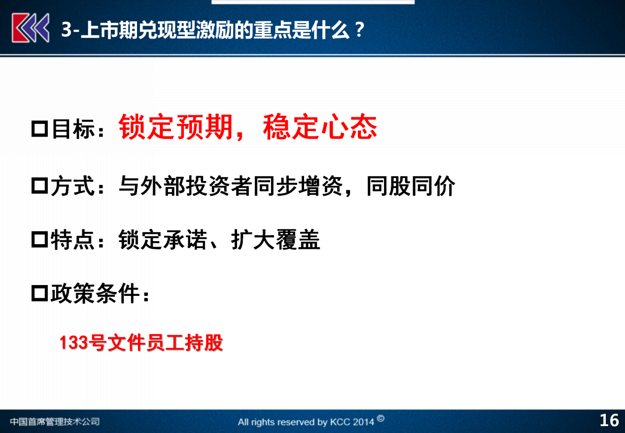 第三个阶段,上市期兑现型激励。科技型公司在资本市场上越来越容易实现股票的发行和上市,需要做的上市期兑现型激励,把上市条件与股票激励的工作优先结合在一起。