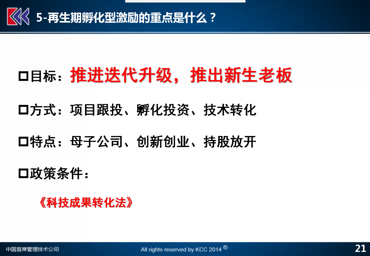科技型公司长期激励的第五个环节,我们称之为叫再生期的孵化型激励的重点。再生期就是一个技术的迭代发展是有瓶颈期的,那么在一个技术不断地向大发展的过程当中产生了若干的新技术与子领域,公司应该如何把他变成新的产业未来的基础,此时这个激励就称之为叫做推进迭代升级,推出新生老板。