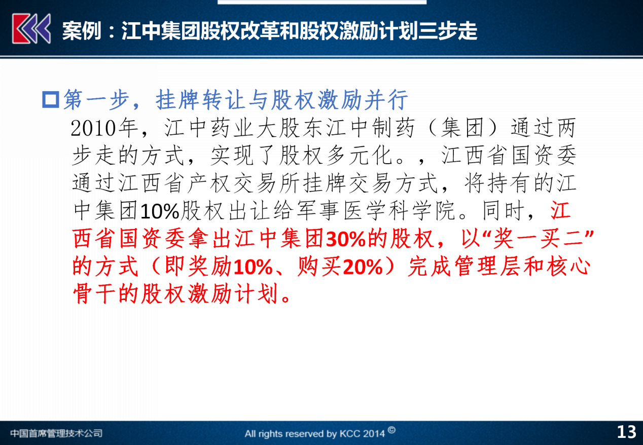 为了进一步说明成长期追加型激励,再给大家讲一个例子,这个例子之前没讲过,这是来自于江西的江中制药集团。江西的江中制药集团实际上在中国的医药领域还不算是一个规模太大,但是还相对比较知名的一家医药企业。那么,这家企业在过去这几年,进行了一些长期激励和股权改革相结合的重要尝试,这个尝试特别值得跟大家来做一个介绍。在2010年,江中制药集团早在多年以前开始,它现在已经做完了。