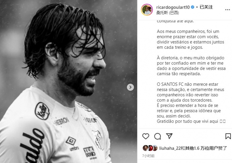 桑托斯俱乐部不应该陷入这样的境地,相信我的队友们会在球迷的支持下,扭转当前的局面。现在我必须选择离开,着是合适的时间,所以我做出了这样的决定,感谢这里的一切。