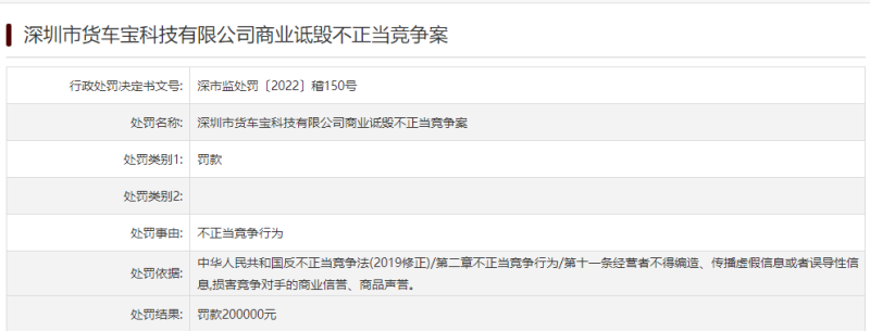 蓝鲸TMT频道7月22日讯,据天眼查显示,近日,深圳市货车宝科技有限公司因不正当竞争行为,被深圳市市场监督管理局罚款20万。