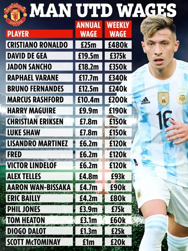 《太阳报》也列出曼联队内的薪水排行(统计似乎遗忘了马夏尔,小编查询了一下,马夏尔的薪水为25万镑),其中C罗周薪48万镑居首,新援利桑德罗仅第10。