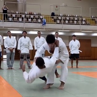 姆巴佩上前体验时,东京奥运会柔道73公斤冠军大野将平与其进行示范。只见大野将平慢慢将姆巴佩摔倒,随后姆巴佩起身两人握手。