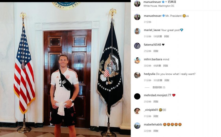 直播吧7月22日讯 拜仁目前正在美国参加季前赛,诺伊尔晒出了自己参观白宫的照片并调侃道:“总统先生