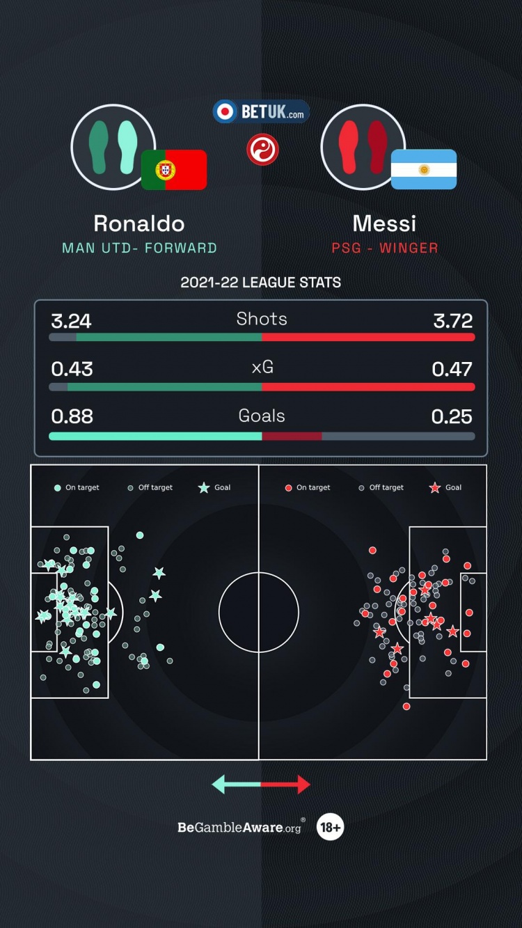 直播吧7月22日讯 据Squawka统计了C罗和梅西上赛季的进球数据,并提问:谁能在22/23赛季打进更多进球?
