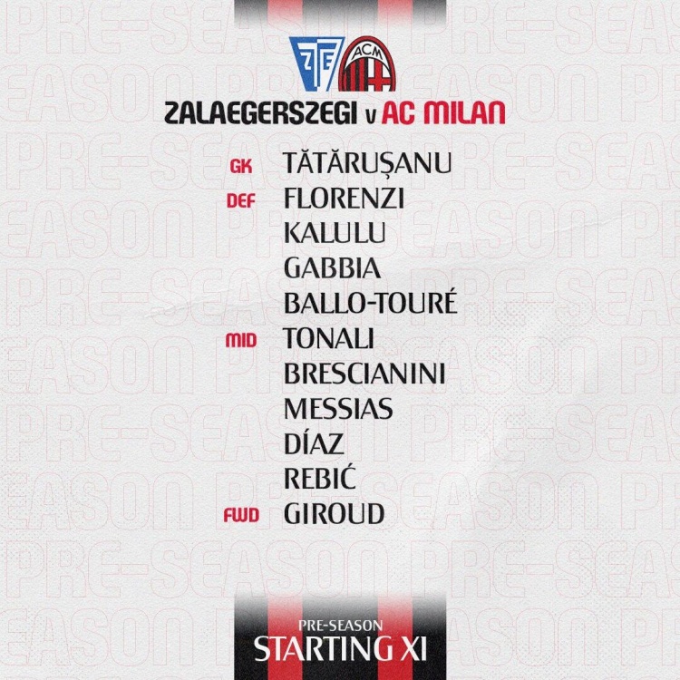 AC米兰首发:塔塔鲁萨努、弗洛伦齐、加比亚、卡卢卢、巴洛-图雷、布雷西亚尼尼、托纳利、梅西亚斯、迪亚斯、雷比奇、吉鲁