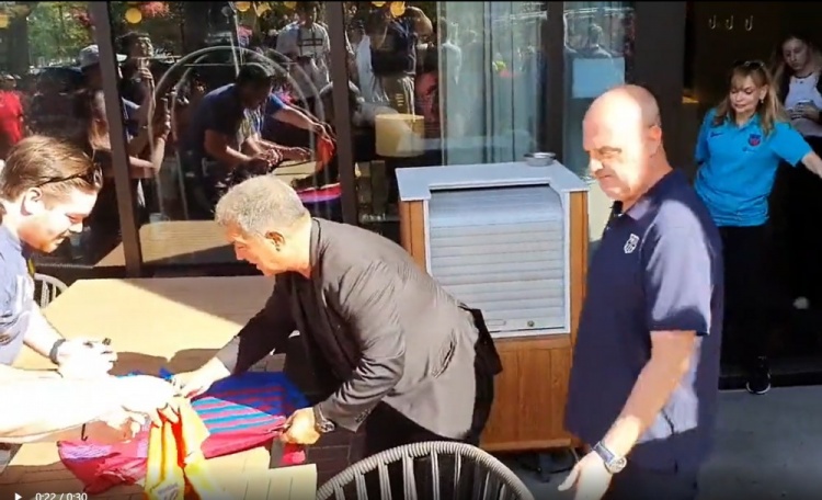 拉波尔塔随队来到达拉斯,等候巴萨的球迷们在他面前高呼“梅西”,而拉波尔塔也在印有梅西名字的巴萨球衣上面签名。