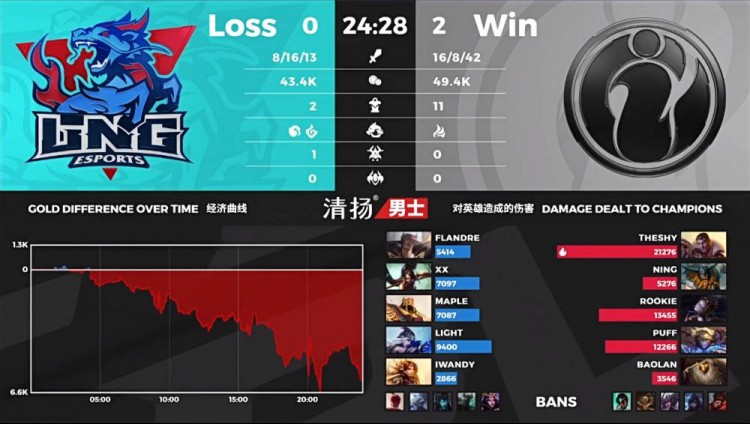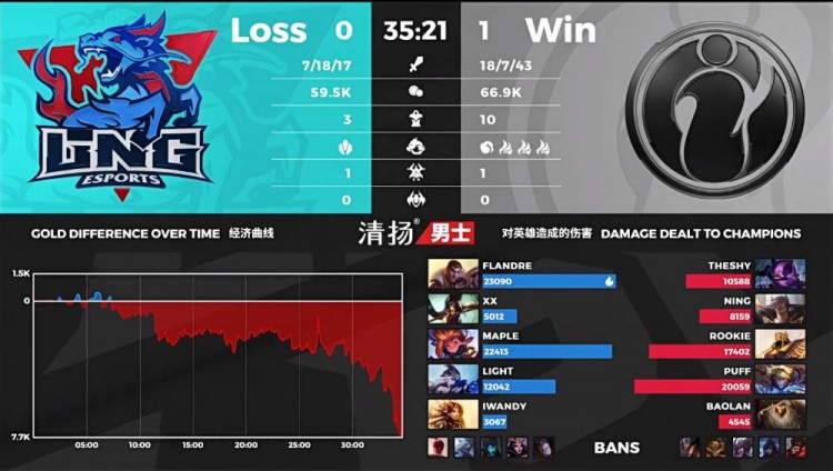 【34:20】IG在下路开团,双方装备差距过大,IG伤害压制击杀LNG四人结束比赛。