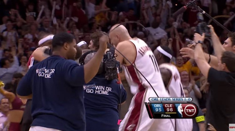 2009年5月23日,东部决赛次战,骑士在主场对阵魔术。终场前1秒,特科格鲁打进一球,魔术以95-93领先!暂停回来,帕夫洛维奇跑出来带走防守,詹姆斯先是往禁区里跑,随后摆脱特科格鲁兜出来,接应莫-威廉姆斯的发球,于弧顶处直接起身投出高弧度三分,皮球稳稳坠入网窝!压哨绝杀!!!詹姆斯的进球让骑士以96-95险胜对手,将系列赛大比分扳成1-1。