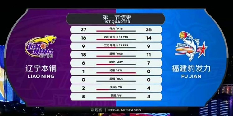 中圈跳球比赛开打,一开场两队的节奏就很快,反击之中何重达率先命中三分,辽宁外援两分还上,劳森上篮也有,而郭艾伦外线手起刀落三分命中,对攻之中两队交替领先,梅奥这边外线三分还有,而陈林坚持球突破立刻2+1还上,僵持之中比赛进入暂停(12-11),回到比赛劳森抛投命中,场边又一次暂停回来来到本节后半段,福建队进攻效率开始下降,辽宁这边连拿六分拉开差距,随着梅奥又一记后撤步跳投再中,福建喊出暂停(20-13),暂停回来福建陈林坚开始发力,独得四分稳住阵脚,而梅奥三分还上,陈林坚中投还有,拉锯战中辽宁保持领先,福建这边卡米然三分命中,随着劳森灵巧突破上篮还有,首节比赛结束,辽宁27-26领先福建一分。