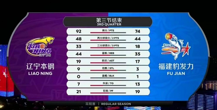 易边再战,赵继伟低手上篮拿到下半场首分,陈林坚急停跳投命中,随后干拔也有,而此时梅奥连中两记三分将领先扩大到两位数,而后中李晓旭外线三分续上火力,拉锯战中劳森再度站出来打成2+1及时止血,分差在两位数上下浮动,比赛进入官方暂停之中(74-65),回到比赛双方继续对攻,贺天举埋伏底角三分命中打停福建(81-67),比赛回来福建没能解决进攻问题,辽宁借助郭艾伦与韩德君的挡拆扩大领先,来到本节末段,郭艾伦领到第五次犯规下场休息,两队的短暂得分荒终于由陈林坚打破,而韩德君2+1轻松打成,你来我往之中辽宁保持大比分领先,王哲林这边也领到第五次犯规,三节结束,辽宁90-72领先福建。