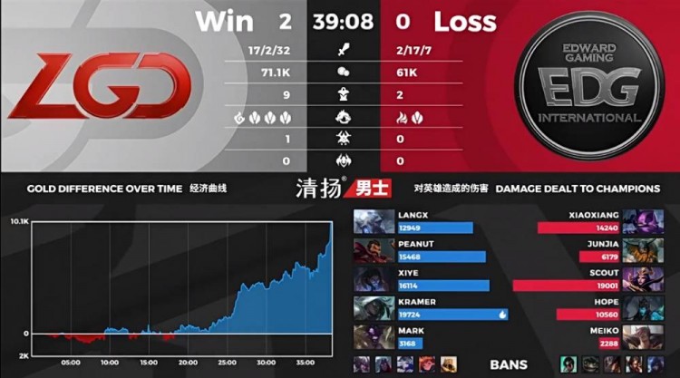 【38:50】随后在门牙塔前开团击杀EDG多人后 LGD直接结束了比赛。