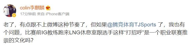 老了,有点跟不上微博这种节奏了,但如果@腾竞体育TJSports 了,我也有个问题,比赛前IG教练跑来LNG休息室跟选手这样“打招呼”是一个职业联赛推崇的文化吗?