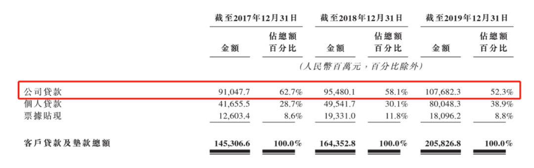 作为贷款组合的最大组成部分,东莞农商行的公司贷款在2017-2019年分别占客户贷款总额的62.7%、58.1%及52.3%;从规模来看,公司贷款由2017年的910.48亿元逐年增至2019年的1076.82亿元。