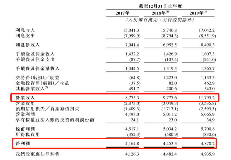 据招股书披露,2017-2019年东莞农商行的营业收入分别为87.75亿元(人民币,单位下同)、97.78亿元和117.95亿元,年均复合增长率为15.9%,同期净利润分别为41.65亿元、44.53亿元和48.70亿元,年均复合增长率为8.13%。