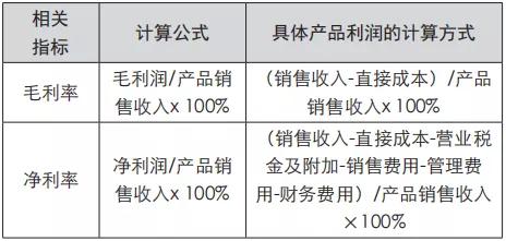 其次,就销售具体产品角度“利润率”的核算而言,虽然也采取“收入-成本”的计算思路,但在具体的计算项目上,与企业利润存在较大差异。首先,二者的收入计算口径并不一致,产品层面仅限于具体商品的销售情况,并不涉及企业整体的收入情况;其次,扣除项目差异较大,在“毛利率”的计算中基本仍采用“销售收入-销售成本”的形式,在具体产品“净利率”的计算中通常仅扣除直接成本、期间费用(包括管理费用、财务费用、销售费用等)、营业税金及附加等与企业生产销售紧密相关的要素,并不涉及资产减值损失、投资损失、营业外支出、所得税费用等营业外的广义的成本费用项目。因此,相较于企业利润核算的要求,具体产品的“利润率”的计算更为具体,且其“净利率”的计算方式更能反映出产品成本与收入之间的比例关系,体现出产品本身的盈利能力。具体的计算方式如下: