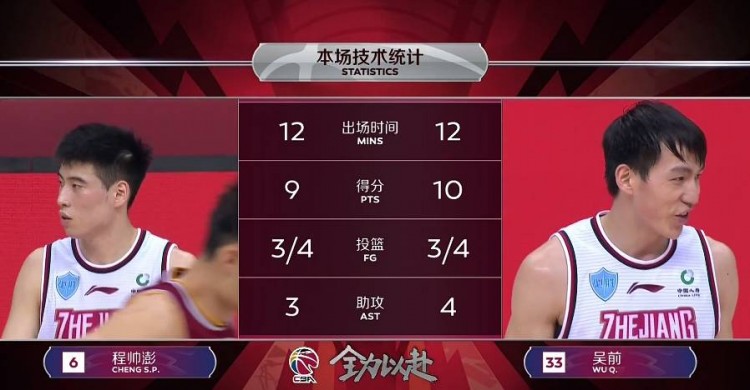 第一节,吴前和程帅澎合力贡献19分7助攻,其中前者拿下10分4助攻,后者得到9分3助攻。