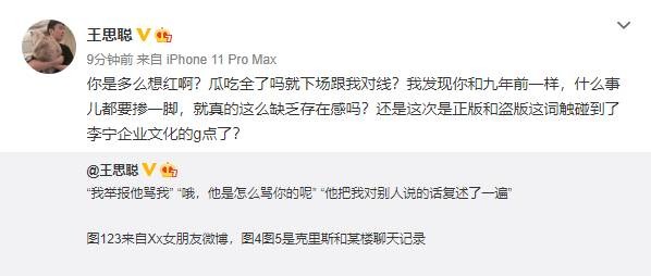 你是多么想红啊?瓜吃全了吗就下场跟我对线?我发现你和九年前一样,什么事儿都要掺一脚,就真的这么缺乏存在感吗?还是这次是正版和盗版这词触碰到了李宁企业文化的g点了?
