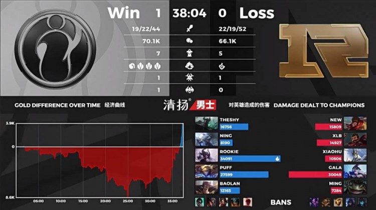 【22:00】两边在中路开团,IG一波乱战二换五团灭了RNG后破掉中路高地;