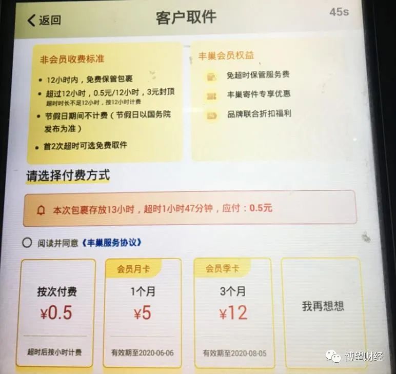 不久前,丰巢科技宣布,自4月30日起,将对滞留快件的非会员用户在超时12小时后收费0.5元/12小时,3元封顶,法定节假日不计费。同时,还推出了每个月5元的会员服务,会员可享受7天长时存放。