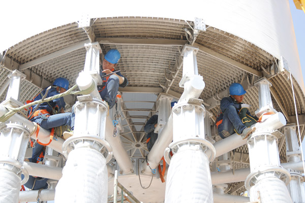 “我们在平抗安装之前,就组织队伍开展了一系列科技管理项目的融合,整个安装过程都在无死角的严控下进行,实现了平抗每个支架点的水平标高差控制在2mm之内。”项目技术负责人张栋说道。在平抗安装前,项目部就通过BIM技术模拟,将现场设备情况、吊车作业情况展示出来,并利用三维信息,现场指导施工与交底。针对实际施工阶段,项目部严抓各环节施工技术指标,从基础复测到支架安装、支柱绝缘子安装和米支架安装,过程也细化到每个螺栓涂抹黄油和力矩复测等。