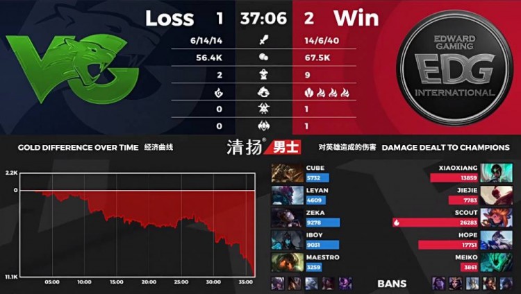 【36:35】凭借远古龙的超高伤害,EDG一波团灭VG后结束比赛。