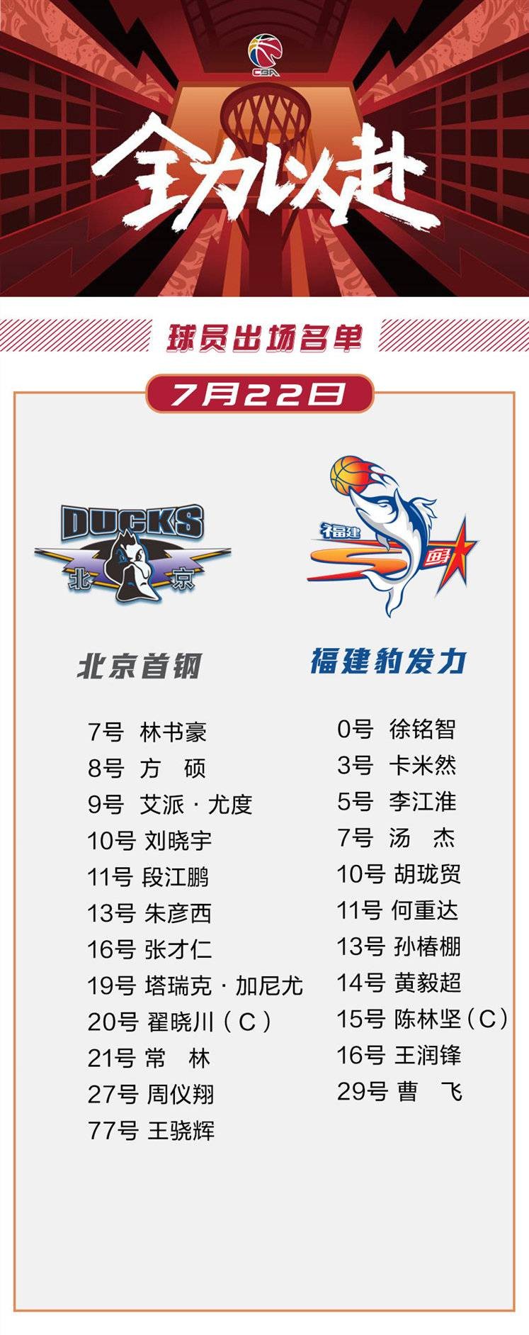 7月22日讯 今晚CBA常规赛,福建将对阵北京。赛前,两队此役大名单出炉。