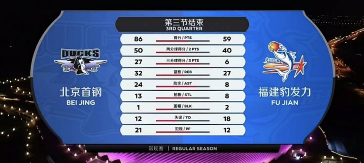 次节开局,孙椿棚稳稳命中跳投,刘晓宇不幸受伤离场,翟晓川连续得手拿到四分,汤杰借掩护跳步篮下打成2+1,这也成为福建在进攻端位数不多的亮点,暂停调整过后孙椿棚强杀篮下打板命中,周仪翔反击一条龙拿到两分,重新回到场上的刘晓宇低手上篮打成2+1,朱彦西再中定点三分,李江淮跟进飞身上篮得手,陈林坚篮下命中翻身跳投,福建稍稍缩小分差。半场战罢,北京59-39领先福建。