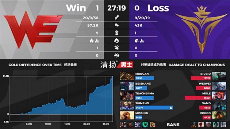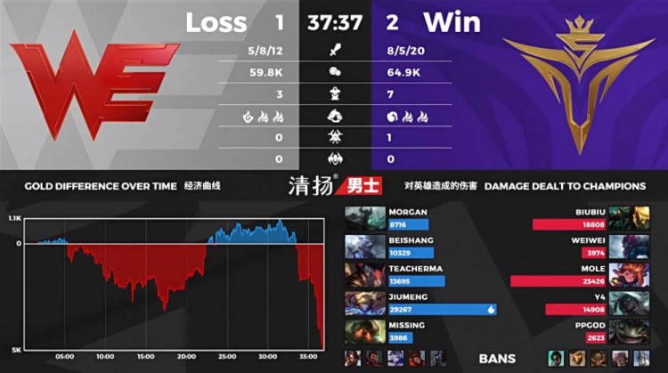 【33:45】双方在小龙团处拉扯、WE先行开团但是凯南进场过晚错失良机,V5一波团灭直接结束比赛。