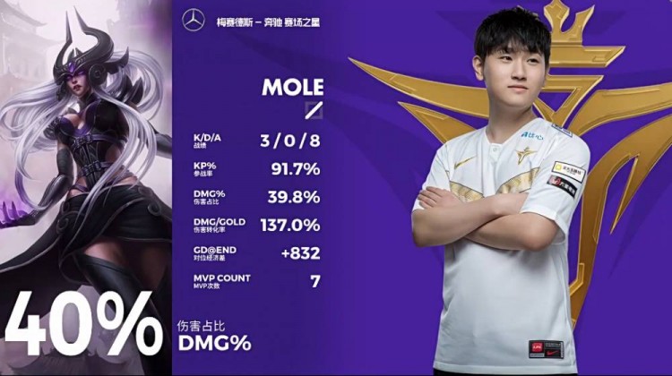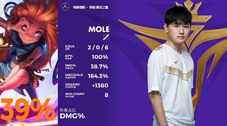 【36:50】带着大龙buff推进中路、V5强势POKE、一波击杀了铁男、狗熊、EZ三人,虽然卡牌断掉兵线但是V5还是直接一波结束了比赛。