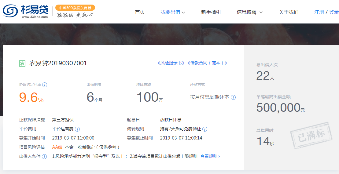 最夸张的来了,杉易贷目前抢标已经精确到秒,截个图大家体会下,14秒满标,什么概念?考虑到登录和网站的卡顿,很可能眨个眼,项目就满标了。笔者查阅杉易贷年后到现在的网站发标数据显示,基本所有项目满标时间都在30秒附近或以内。