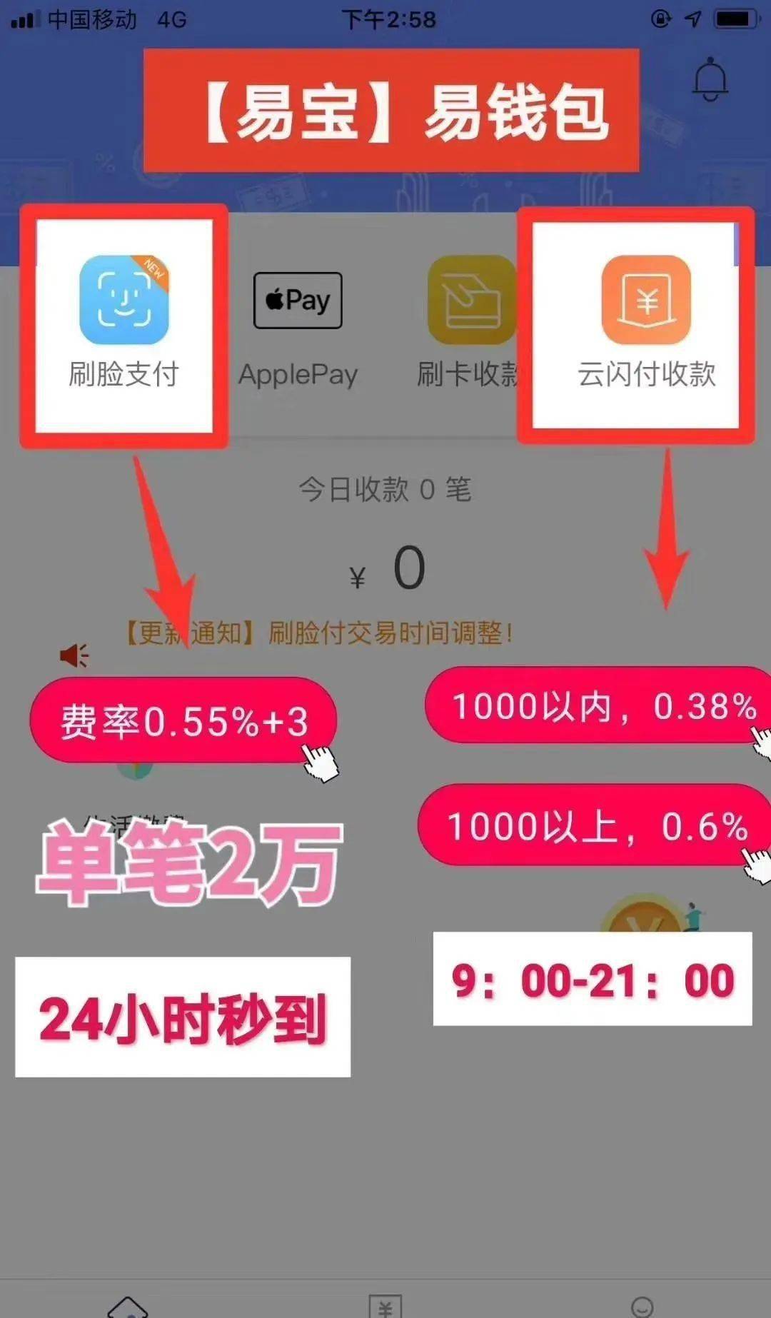 易钱包️刷脸支付费率:交通,招商,兴业,民生,农业,邮储6家银行费率0.6%+3,其余所有银行0.55%+3,限额单笔2万,单日20万,单月200万。