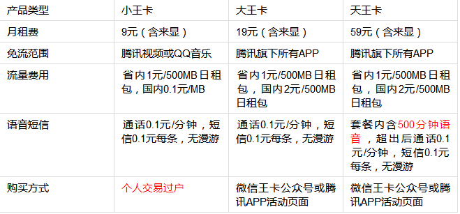 腾讯王卡是联通和腾讯合作推出的,共有小王卡、大王卡和天王卡三种产品。目前小王卡已经停售,可以买到的是后两种。