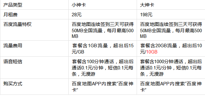 百度神卡两种类型的资费差距较大。小神卡月费仅28元,套餐有基本的流量和语音通线元/GB的价格,资费非常优惠。