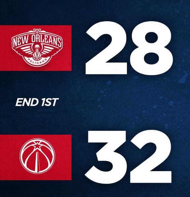 首节比赛,奇才率先找到手感,布莱恩特和八村塁命中三分,帮助奇才打出6-0开局。但奇才随后连续出现3次失误,鹈鹕趁机反击,英格拉姆命中三分,鲍尔快速反击上篮得手,鹈鹕抹掉分差。此节中段,奇才及时调整过来,特洛伊-布朗续上三分,八村塁冲击篮筐拿下4分,里外开花的奇才以20-13重新取得领先。虽然霍勒迪之后为鹈鹕射入三分和抛投,但是投出手感的布朗和八村塁马上杀伤内线还以颜色,奇才以27-20保持着领先。此节末,布朗再为奇才投进1记三分,不过鹈鹕替补杰克逊、海耶斯在篮下得手回敬,帮助鹈鹕在首节结束时以28-32紧咬比分。