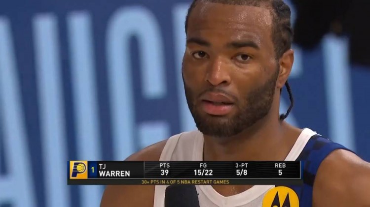 本场比赛,沃伦出战37分钟,22投15中,其中三分球8投5中,另外罚球4罚4中,砍下39分5篮板1助攻,近五场比赛第四次砍下30+。