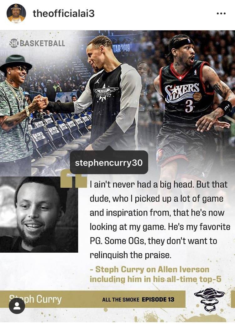 艾弗森发的图片是库里在做客《ALL THE SMOKE》节目时的一段话。当时库里被问到,入选艾弗森心目中的历史前五有何感受,库里说:“这是我得到最高的赞誉了。我从艾弗森那里学到了很多,他的比赛风格、他的灵感——而现在这个家伙也会看我的比赛。他是我最喜欢的控球后卫。作为名宿,他总是对后辈们鼓励有加。”