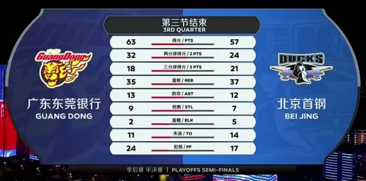 易边再战,广东这边易建联扛起攻防大旗打出一波7-0小高潮,随着任骏飞反击跟进再取两分,北京喊出暂停(46-37),暂停回来朱彦西命中三分,随后尤度单打易建联2+0打成,赵睿突破左手抛投还上,而尤度内线也有,林书豪发挥个人能力跳投还有,拉锯战中徐杰抛投打进,尤度这边晃飞两人内线也有,广东进攻当中造成朱彦西第五次犯规,随后周鹏连拿5分助广东将领先再度扩大到8分,来到本节末段北京进攻效率开始下降,广东这边胡明轩突破得手,分差来到两位数,广东这边杜润旺火气有点大被吹技术犯规,两队在本节最后时刻频繁制造杀伤站上罚球线取得分数,方硕三分入网,广东最后一攻连续拿到篮板但没能化为得分,三节结束,广东63-57领先北京。