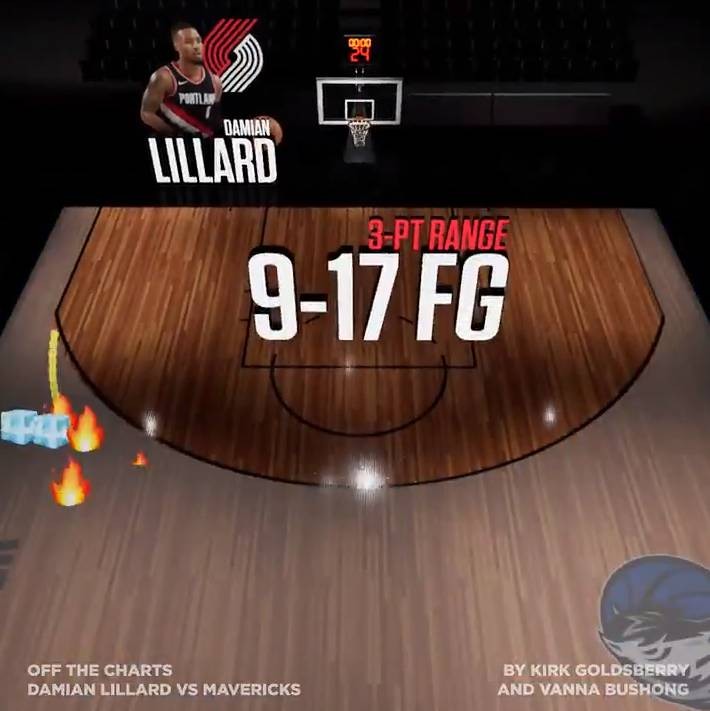 随后,知名数据分析师Kirk Goldsberry更新社媒动态,用视频来展现利拉德今日比赛的进球分布: