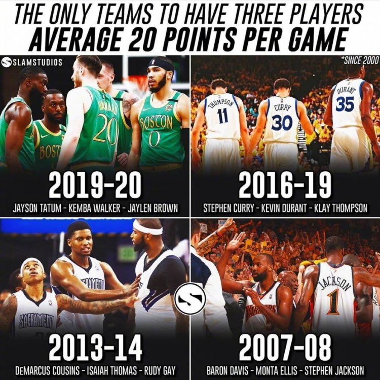 本赛季,绿军场均得分过20的三位球员分别为:塔图姆23.4分、沃克20.4分、布朗20.3分。13-14赛季的国王阵中,小托马斯、考辛斯以及盖伊,也同样达成了该成就。