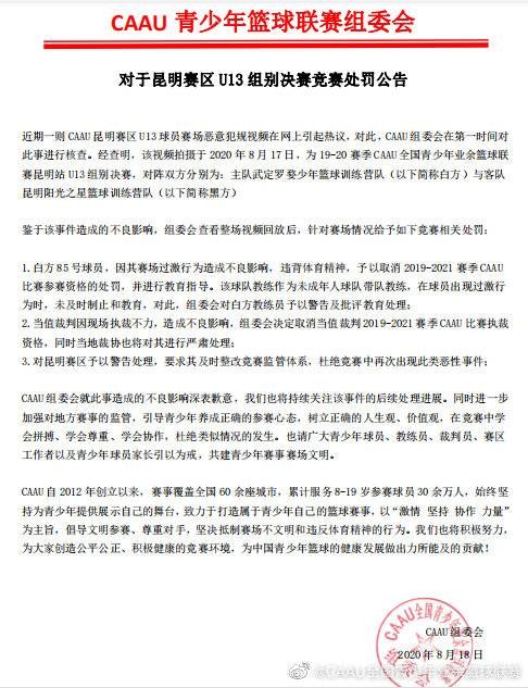 8月18日讯近期,全国青少年业余篮球联赛(以下称CAAU)昆明赛区U13组别决赛的比赛视频在网上引发热议,视频中的小球员多次使出非篮球动作,影响恶劣。CAAU发布了对此的处罚公告,其中白方85号以及当值裁判被处罚禁赛2019-2021赛季,全文如下: