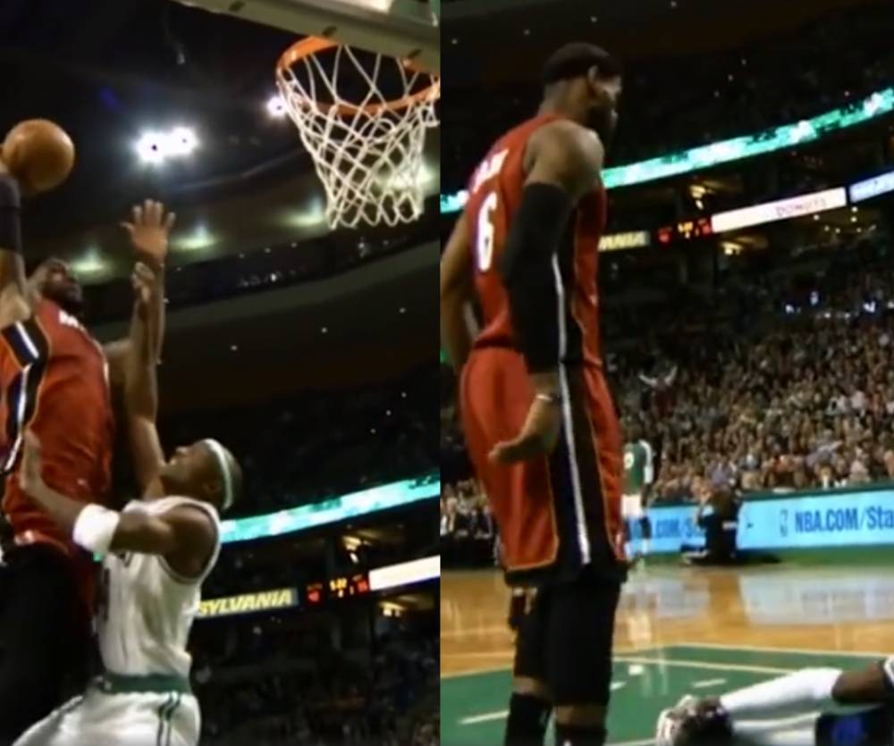 3月18日讯 在7年前的今天,前热火球星勒布朗-詹姆斯在比赛中战斧隔扣扣倒前凯尔特人后卫杰森-特里。
