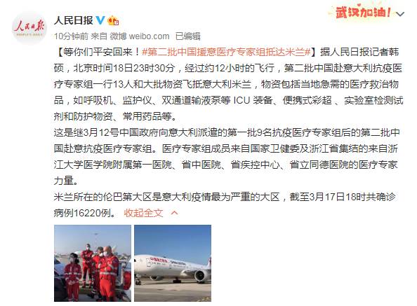 据人民日报记者韩硕,北京时间18日23时30分,经过约12小时的飞行,第二批中国赴意大利抗疫医疗专家组一行13人和大批物资飞抵意大利米兰,物资包括当地急需的医疗救治物品,如呼吸机、监护仪、双通道输液泵等 ICU 装备、便携式彩超 、实验室检测试剂和防护物资、常用药品等。