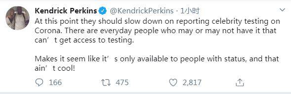 前NBA球员 现评论员Kendrick Perkins发推表示:“在这点上,媒体应放缓报道名人的检测结果,因为每天都有可能感染或未感染的人无法进行检测,这让人看起来好像只对有地位的人开放检测,这很不好!”