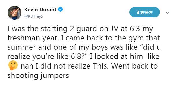 “高一的时候我1米91,在球队打首发2号位。暑假结束后回到训练馆里,一个哥们这样对我说,‘你有没有发现自己好像2米03了?’我看着他,说我不知道,之后就去练习跳投了。”KD在推特上写道。