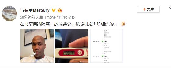 今日,北控主帅马布里在个人社交媒体晒出了自己隔离测体温的照片,配文写道:在北京自我隔离!按照要求,按照规定!听组织的!