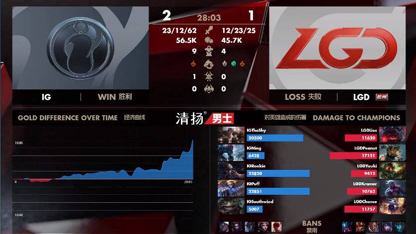 【32:42】LGD推上IG高地,兰博先被泰坦Q中击杀,随后LGD选择一波,EZ被奥恩E起击杀,LGD结束比赛。